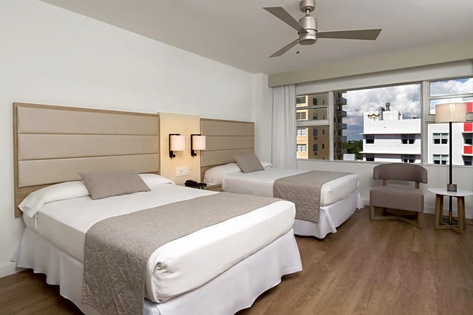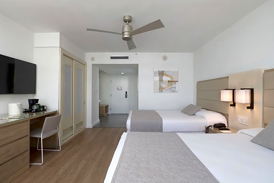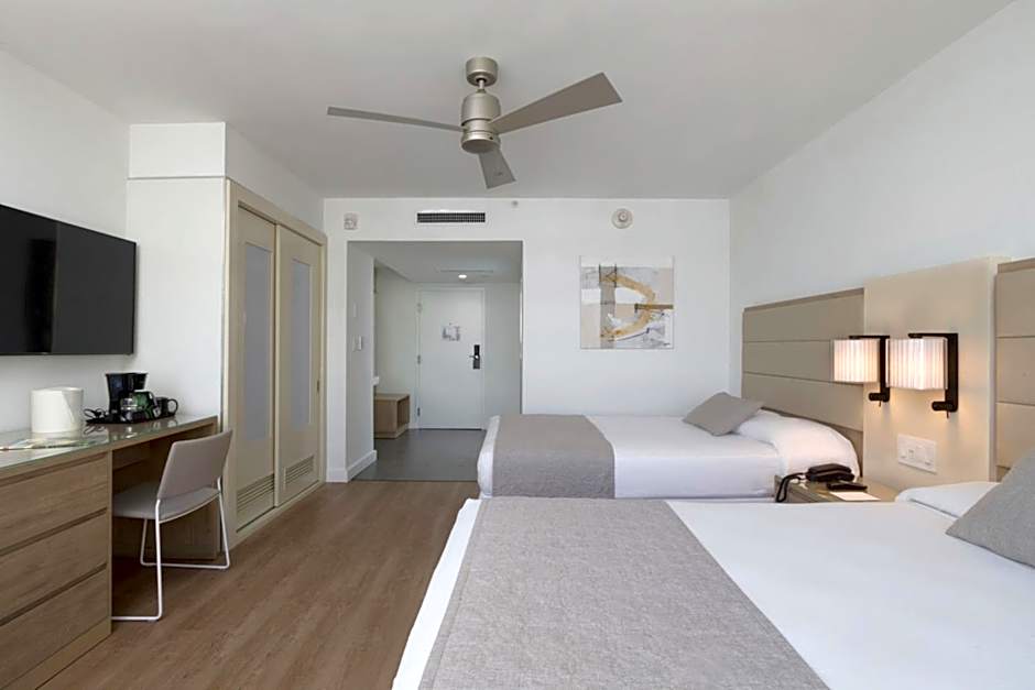 The Hotel Riu Plaza Miami Beach offers you Deluxe Lateral Sea View accommodations, 28-m2 rooms equipped with the best amenities. These rooms have two double beds (135x200 cm), WiFi, satellite TV, air conditioning, a mini-fridge, a coffee maker, and a balcony or terrace with lateral views of the sea.